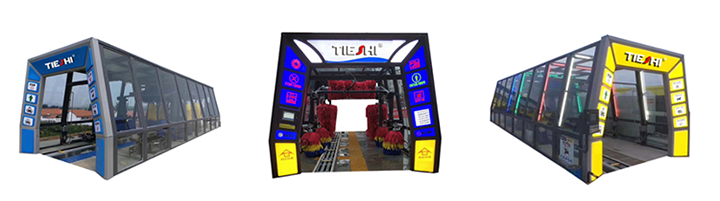 TS-11新型隧道連續式洗車機造型新穎、美觀,機器前臉摒棄其他廠家慣用的碳鋼方形門頭,沿用目前世界上發達國家流行的先進現代拱門造型,采用有色亞克力材質制造,圖示下方LED燈光,室內和夜間使用更加醒目、美觀。